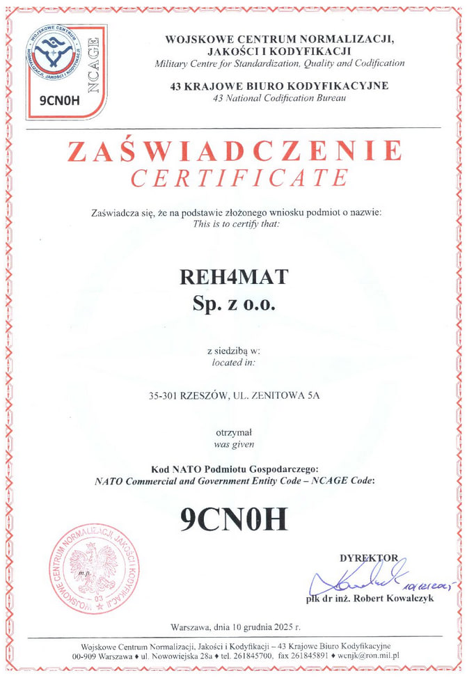 Our brand 4Army is the result of market demand. On 11.10.2012 the company REH4MAT received NCAGE code ,that identifies our company NATO Codification System (NCS NATO Codyfication System). REH4MAT credentials were introduced to the NATO Master Catalogue of References for Logistics), which allows us to supply NATO troops in orthoses, stabilizers and protectors manufactured by our company.